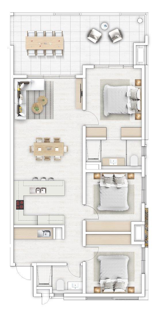 Positioned on the outer corners of each building (Blocks A & B), the Type 1 three-bedroom apartments offer enhanced privacy, generous proportions and open views.