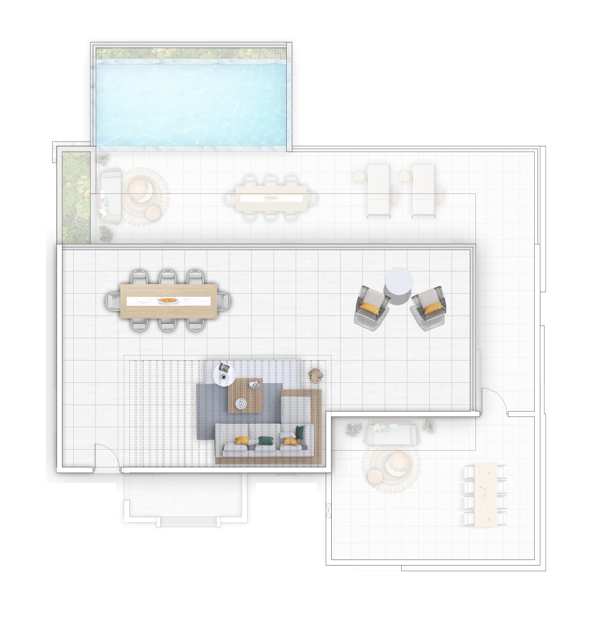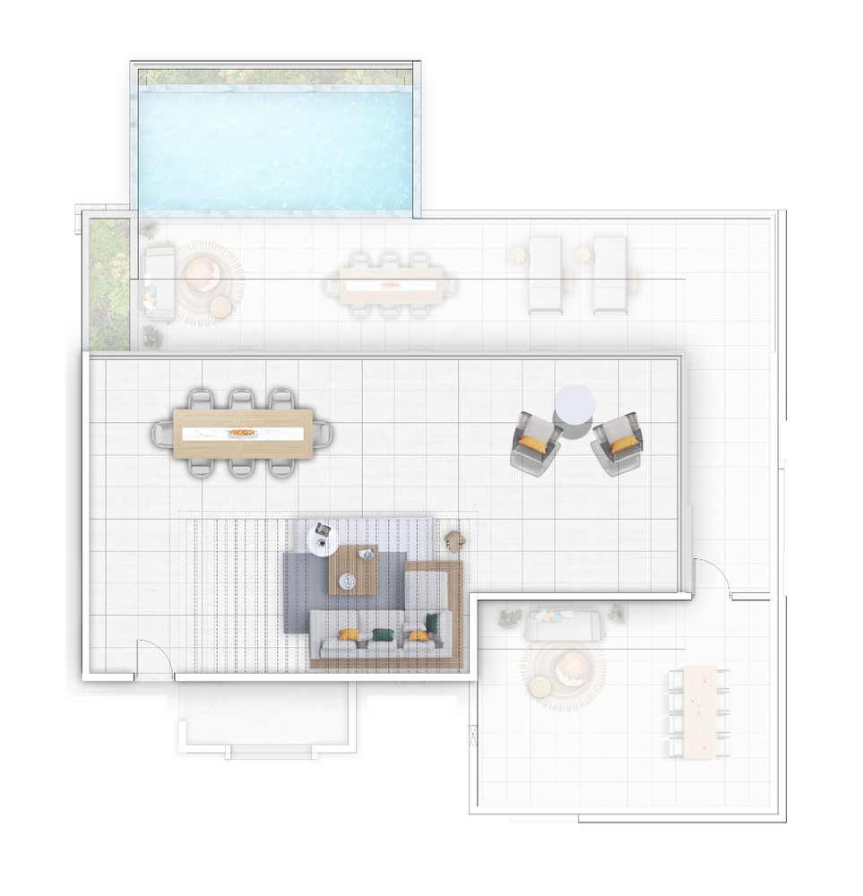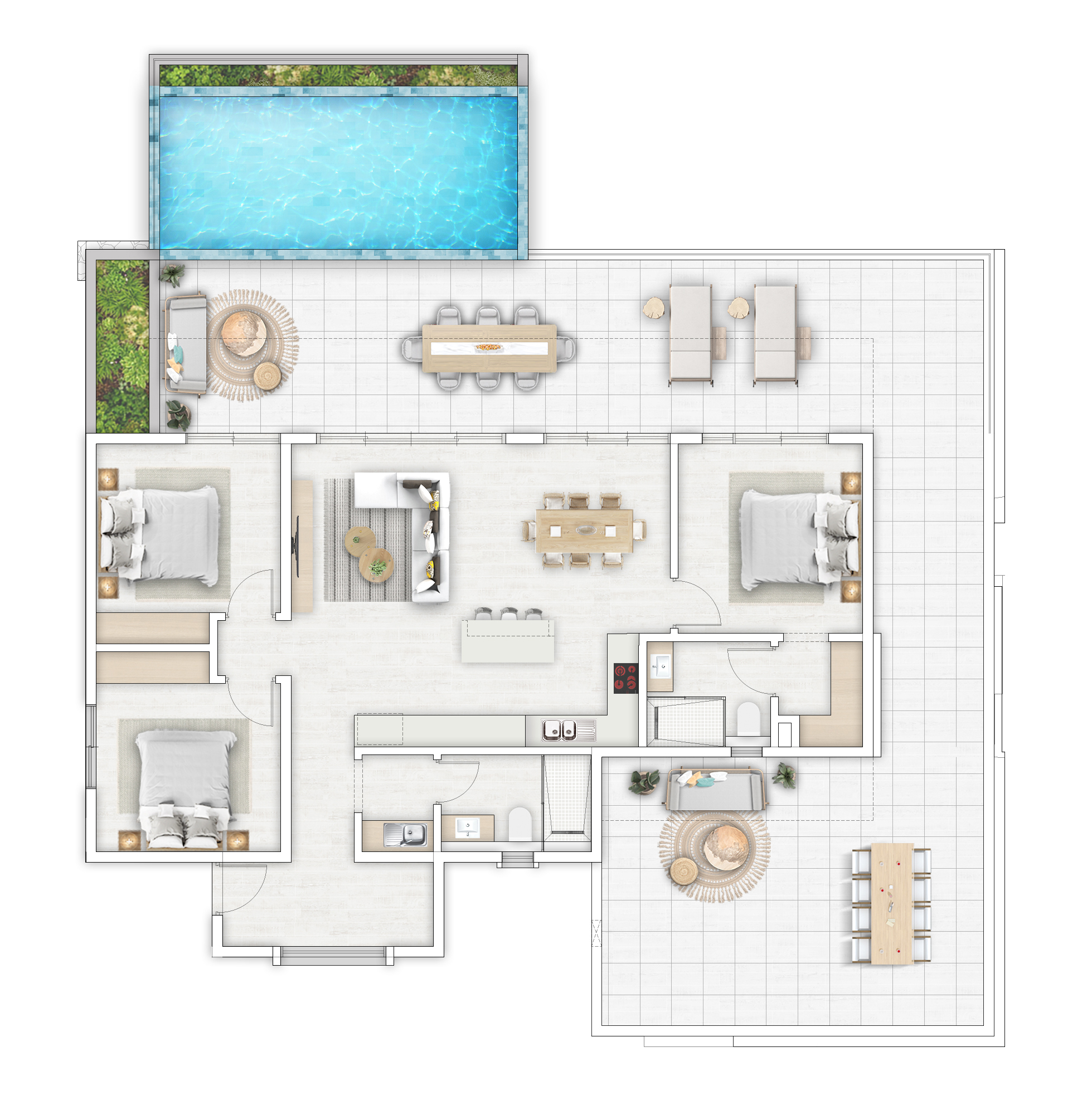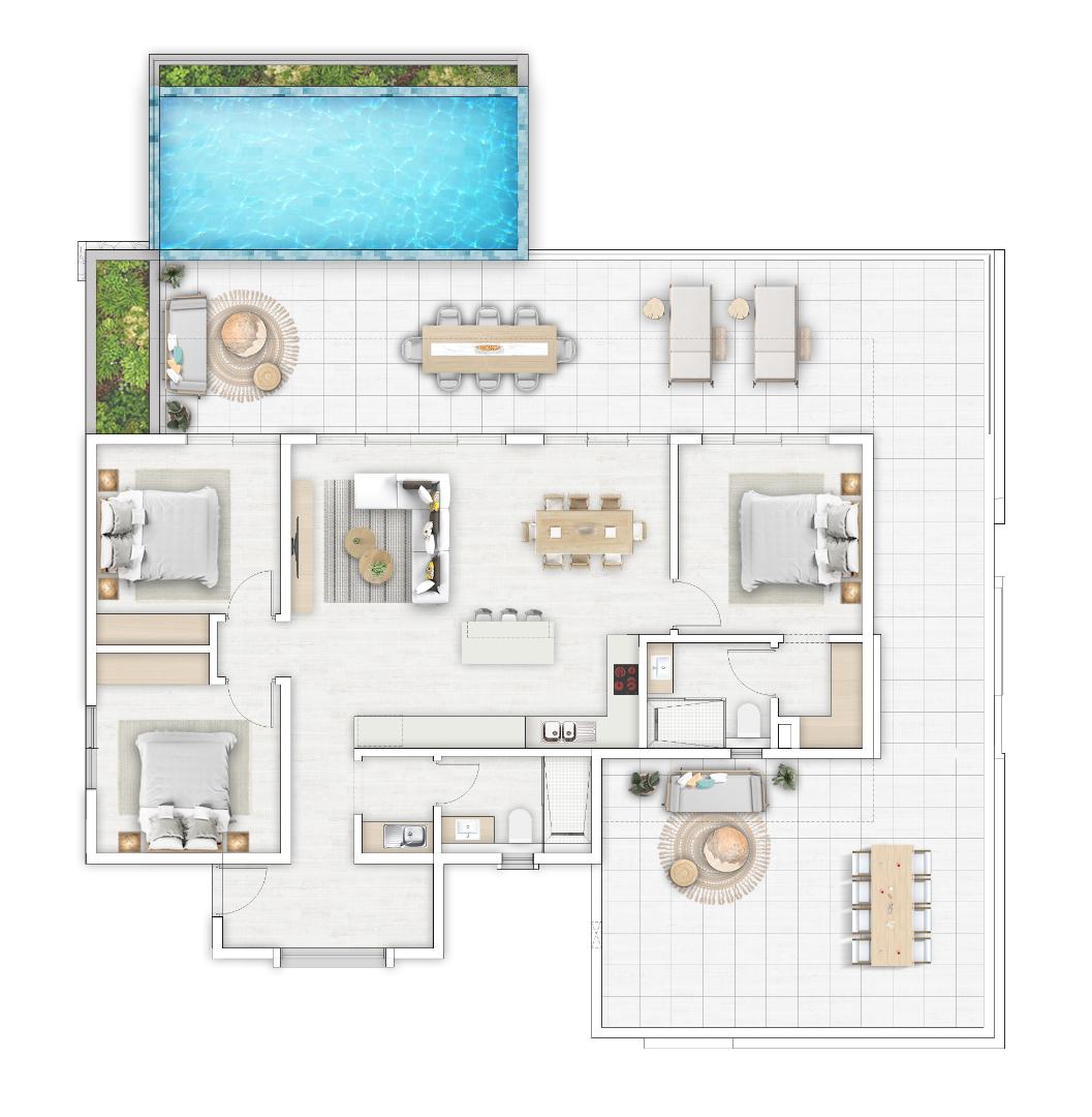 The expansive private terrace features a plunge pool, creating a true indoor-outdoor living experience.