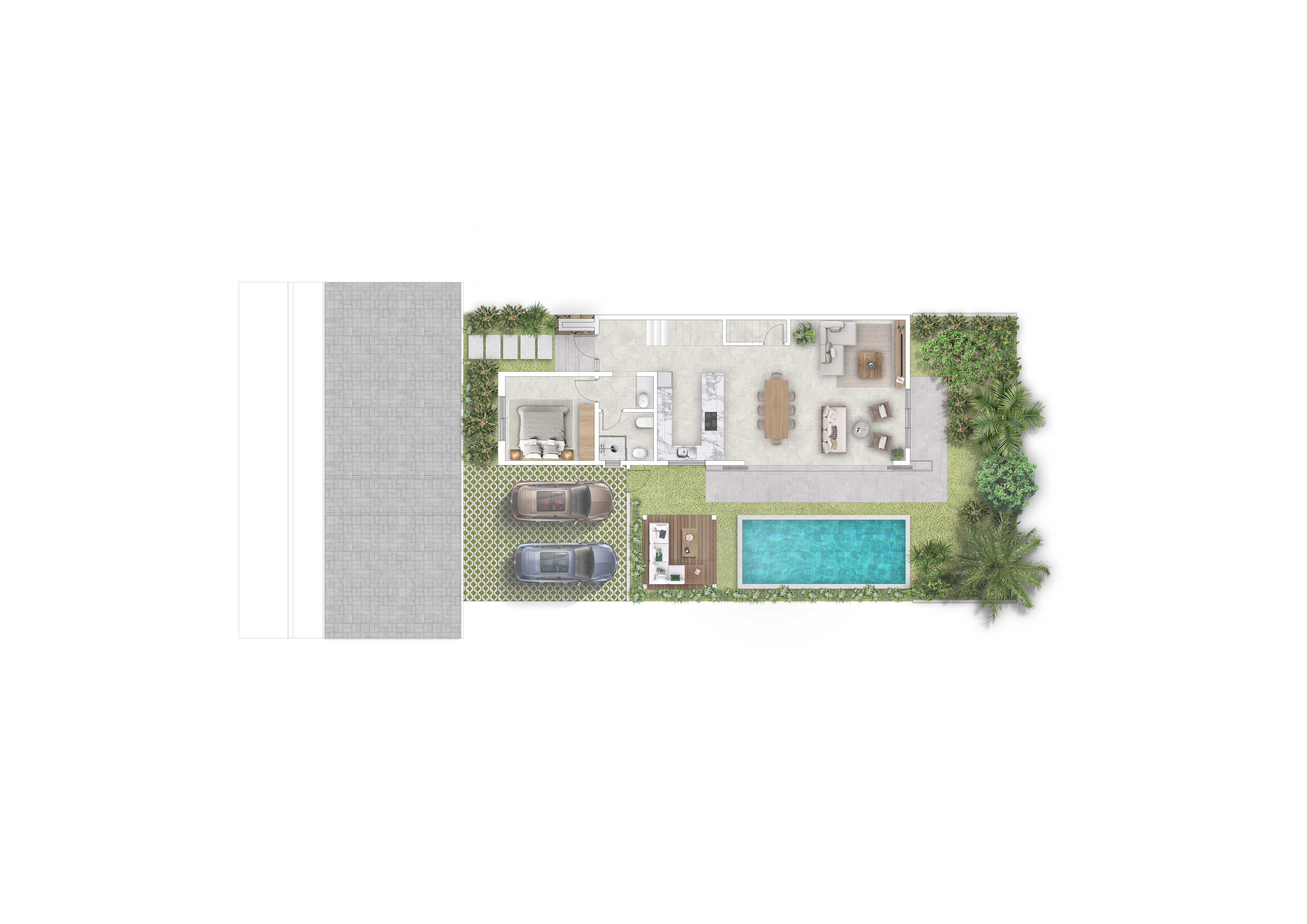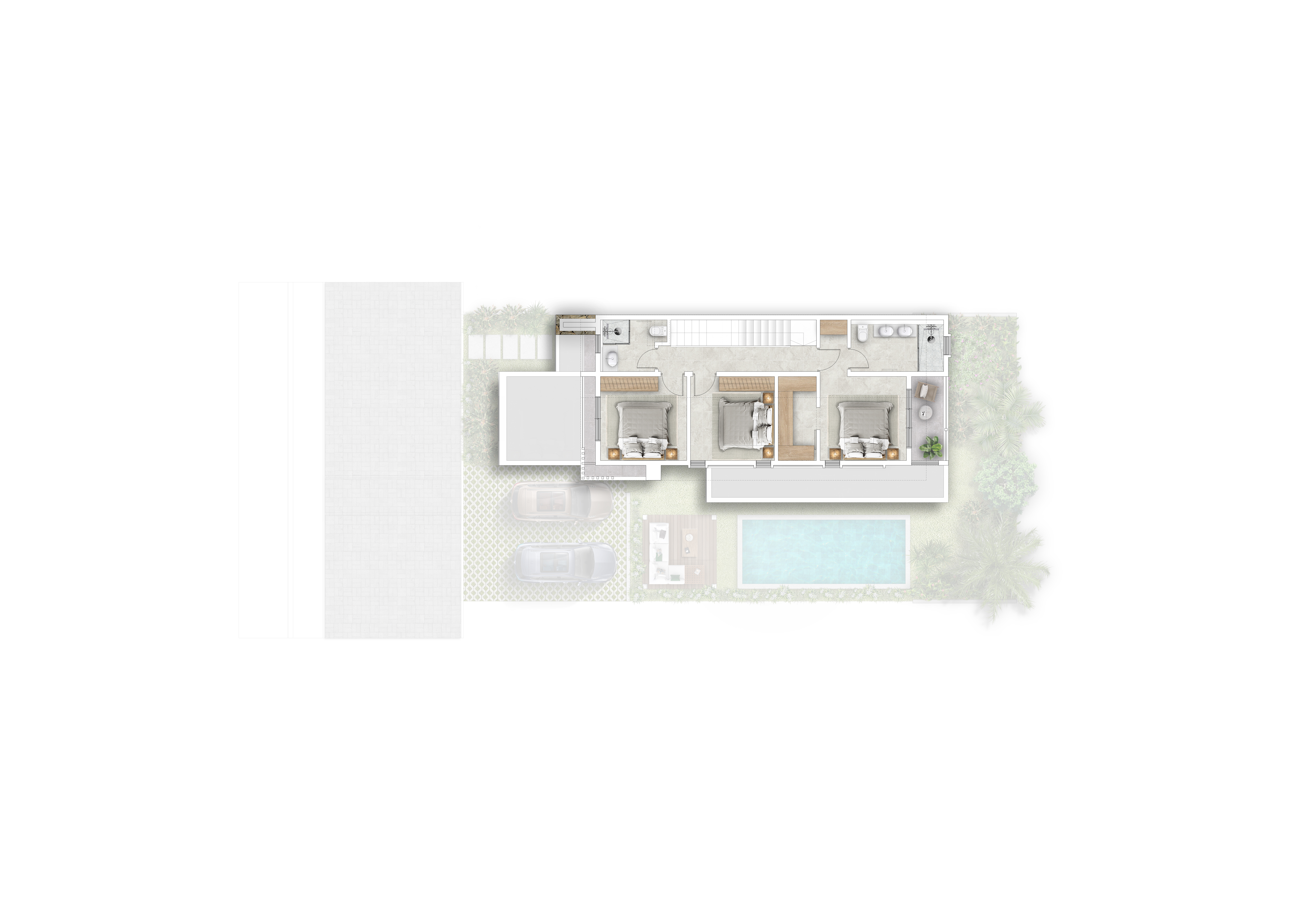 With a total surface of 267 m2, each villa is thoughtfully positioned around the serene common pool area, creating an intimate and harmonious environment.