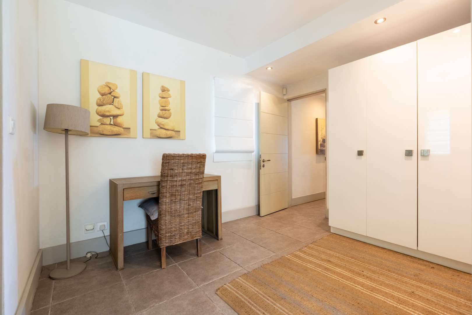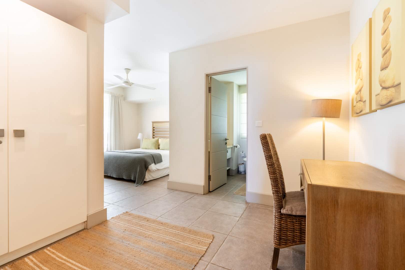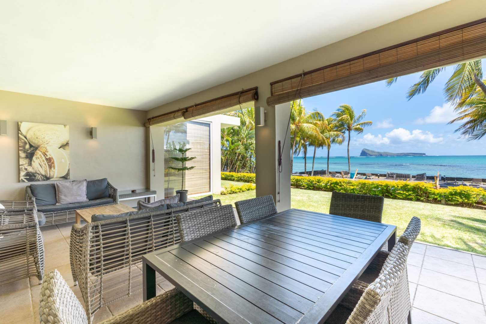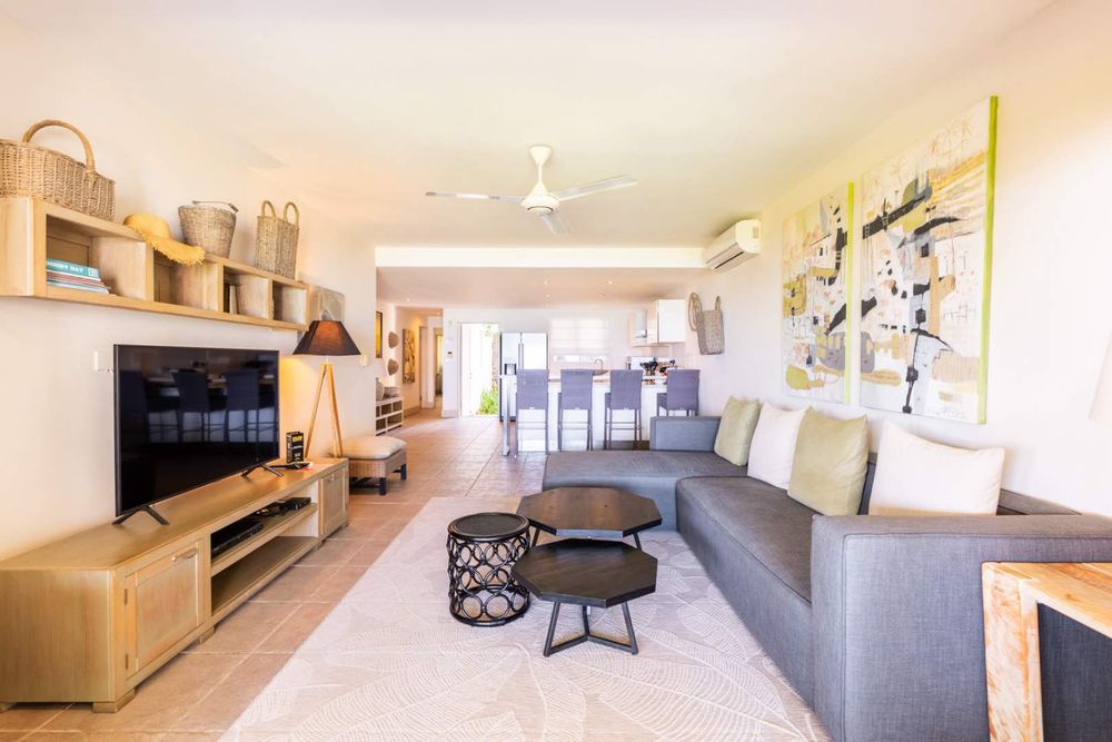 The heart of this home unfolds in a spectacular progression: a fully-equipped gourmet kitchen flows effortlessly into an elegant dining area, which opens to a spacious living room bathed in natural light and magnificent sea views. Then, the grand finale – your expansive private terrace where island living reaches its crescendo against the backdrop of Coin de Mire and the mesmerizing northern islands.