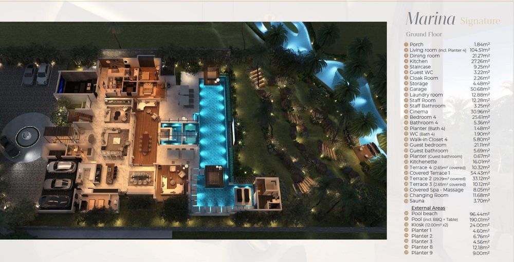 Your magnificent 58-190m2 private swimming pool anchors extensive outdoor entertaining areas complete with integrated barbecue and lounge spaces. The sophisticated wine cellar ensures every gathering is perfectly appointed, while panoramic canal views provide a stunning tropical backdrop.