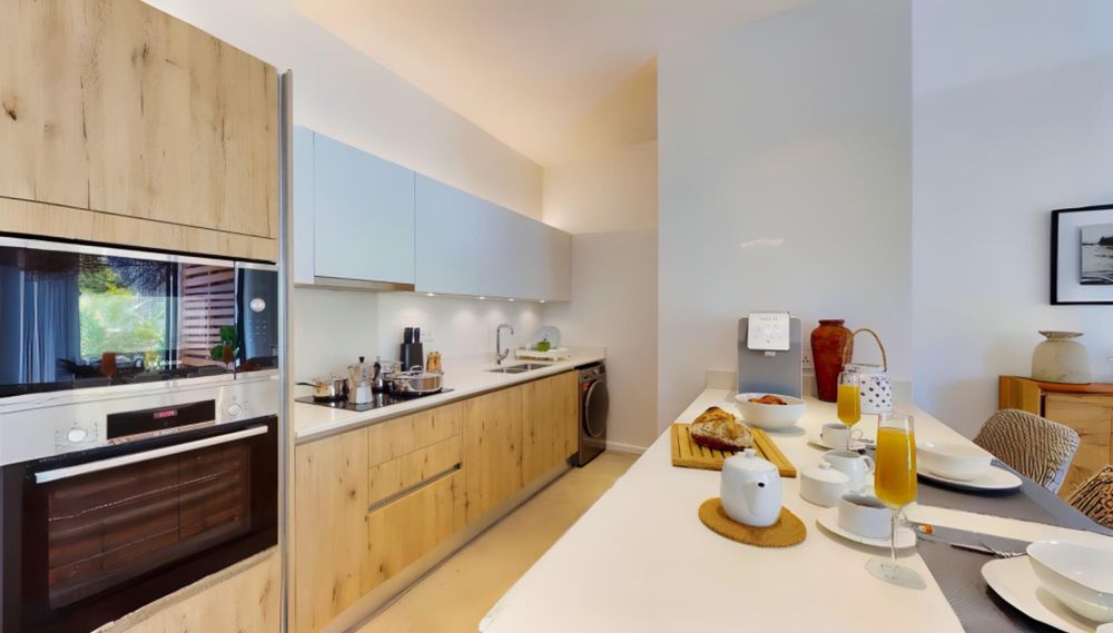 Interiors have been designed with a neutral, natural palette to reflect the island setting and to allow buyers to tailor furnishings easily. Standard finishes include quality ceramic or porcelain floor tiles, modern fitted kitchens with contemporary cabinetry and stone or composite worktops, built in wardrobes in bedrooms, and modern sanitaryware in bathrooms. Lighting and electrical layouts are preinstalled to international standards. For buyers seeking a turnkey solution, an optional deco pack is available that provides coordinated furniture, soft furnishings, window treatments and selected appliances, enabling immediate occupancy with minimal setup.