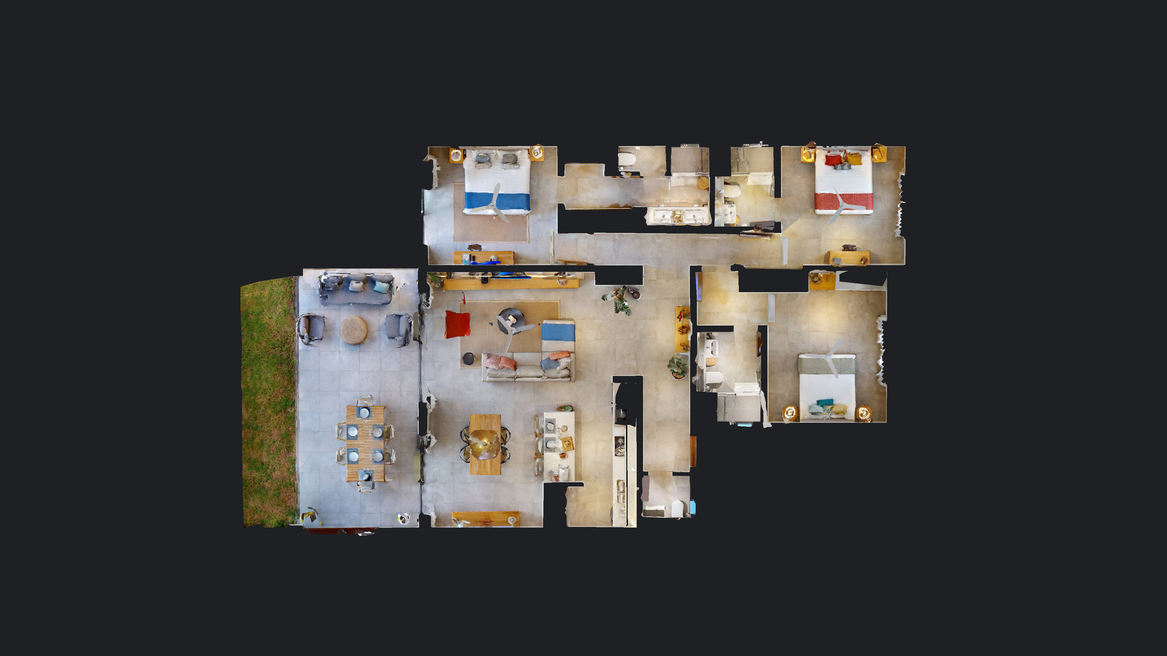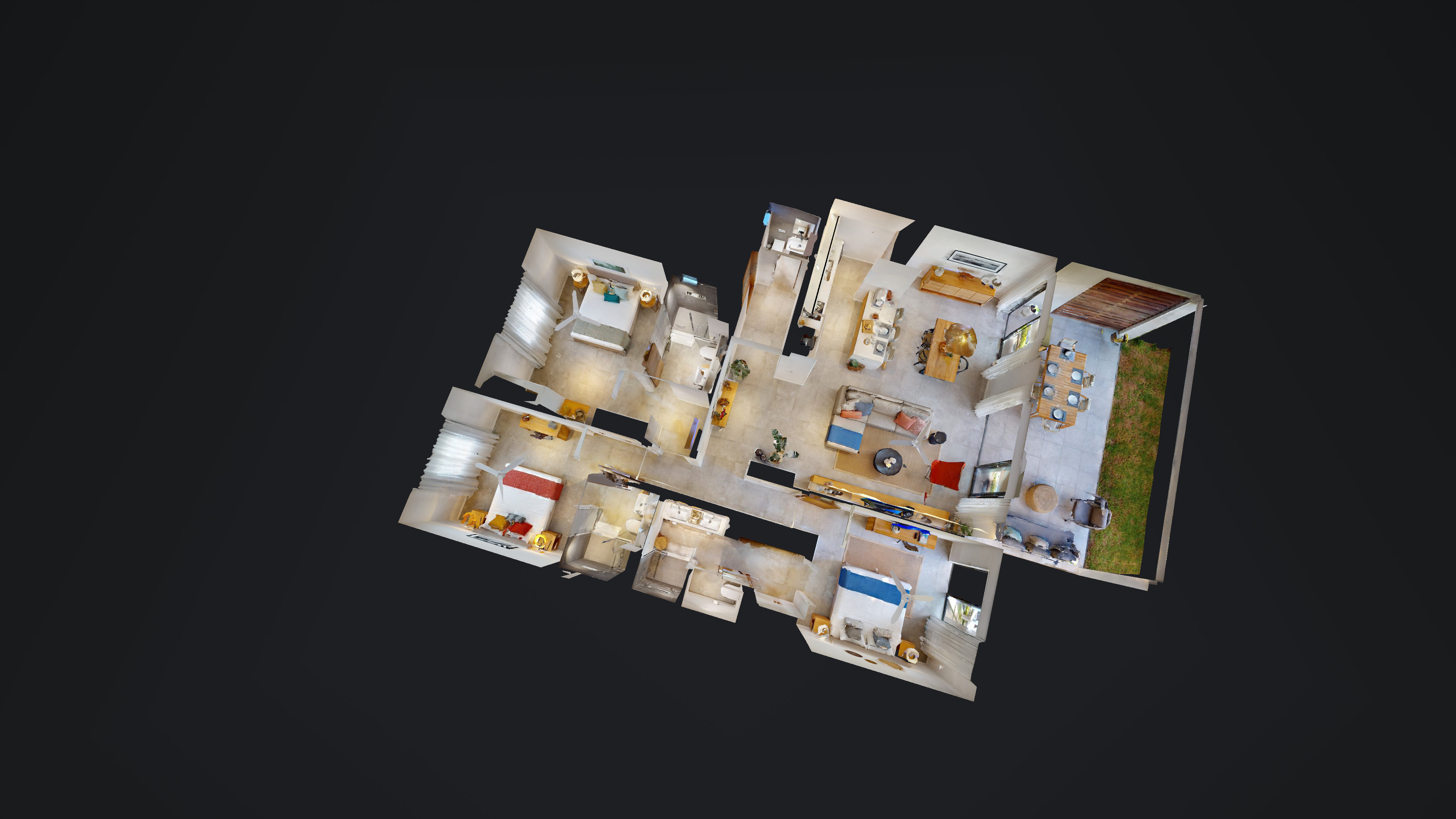 The three remaining apartments are identical in internal size at 137 m2 and comprise two en suite bedrooms and two bathrooms, plus an open plan living and dining area with an integrated kitchen. The ground floor apartment benefits from a private terrace, small garden and a dedicated swimming pool, offering direct outdoor access and year round relaxation. The two first floor apartments each include generously sized balconies that overlook the Zen garden and mature trees, providing elevated outdoor living with sunset vistas. All units feature large bay windows and sliding doors to maximise natural light and cross ventilation, practical circulation for residents with reduced mobility, and a guest toilet in the living area.