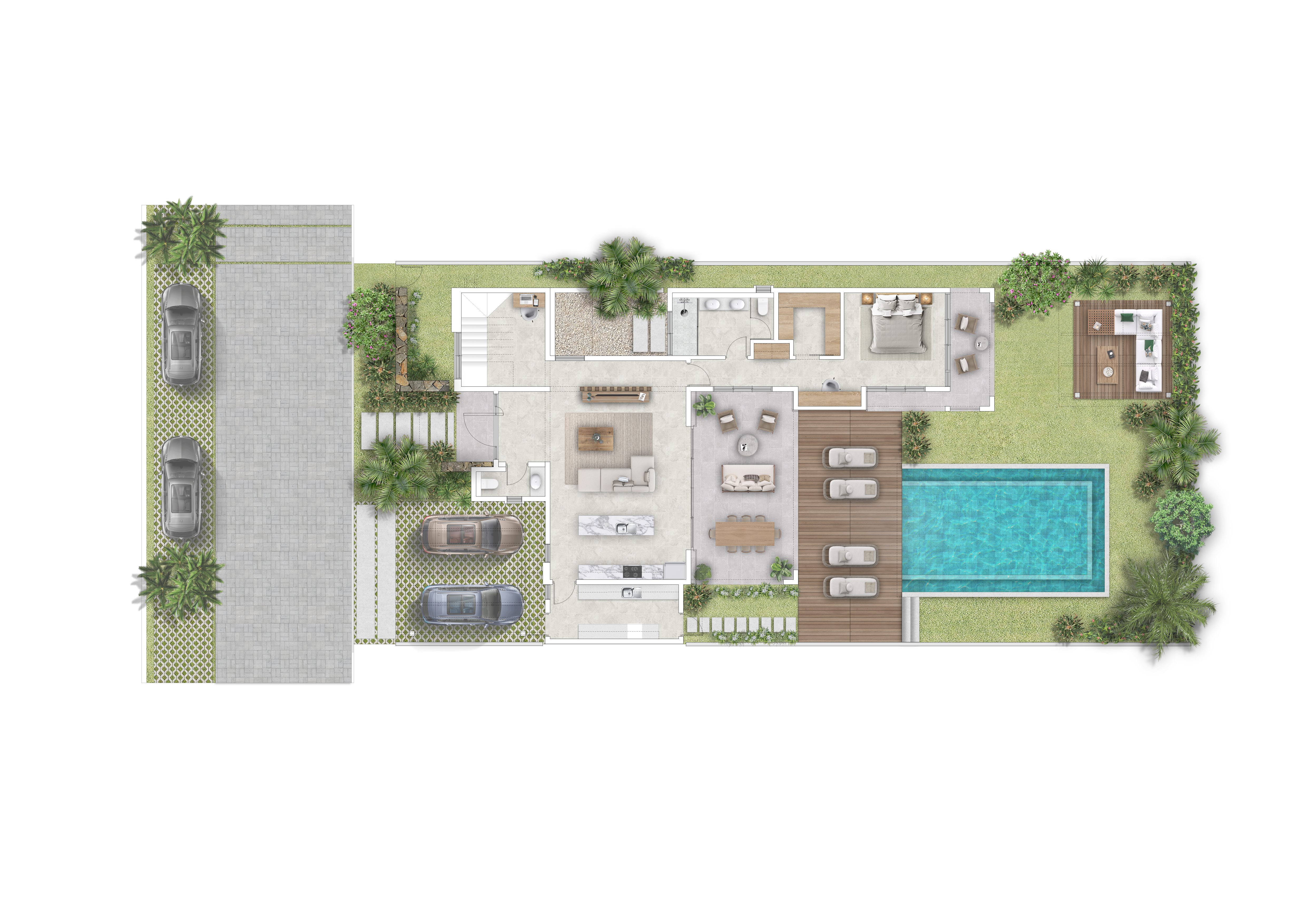 Experience effortless indoor-outdoor living across two thoughtfully designed levels. Each four-bedroom sanctuary features seamless flow between interior comfort and tropical tranquility, complete with your private swimming pool and charming cozy kiosk – perfect for morning coffee rituals or sunset cocktails in your own garden oasis.