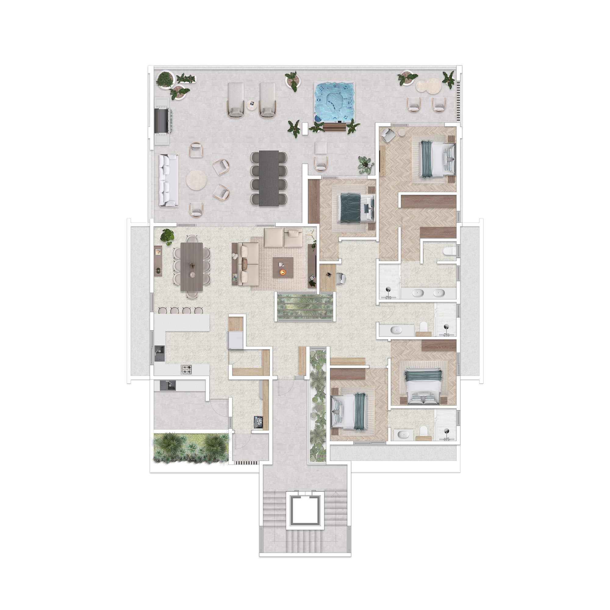 Each identical penthouse is laid out for refined coastal living and comprises four bedrooms (two of which are en‐suite), a guest bathroom, a generous open living and dining area that flows to large terraces including an open‐sky terrace and external terrace, a fully equipped kitchen with pantry and an external kitchen for alfresco entertaining, laundry and drying areas, a dressing room for the master suite, a small office and ample circulation space. An option is available at extra cost to add a private pool on the terrace.