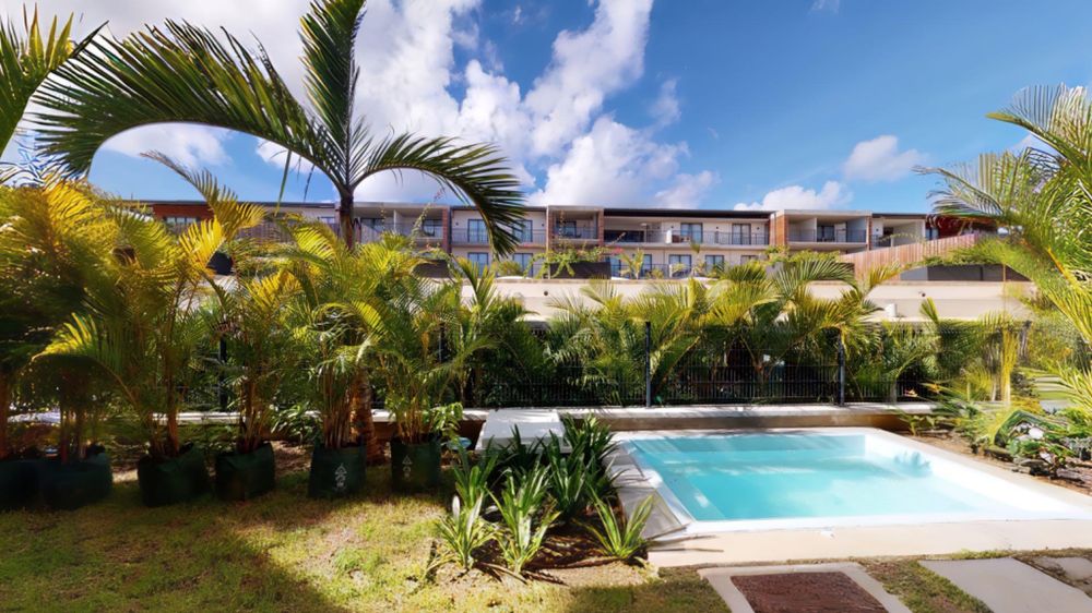 A covered veranda extends from the main living area, creating a perfect outdoor space to enjoy Mauritius' tropical climate while overlooking the inviting pool. While currently furnished, the apartment will be sold unfurnished, allowing new owners to personalize the space to their taste. The ground-floor location provides easy access, making day-to-day living effortless, and the property includes a designated open parking spot for residents.