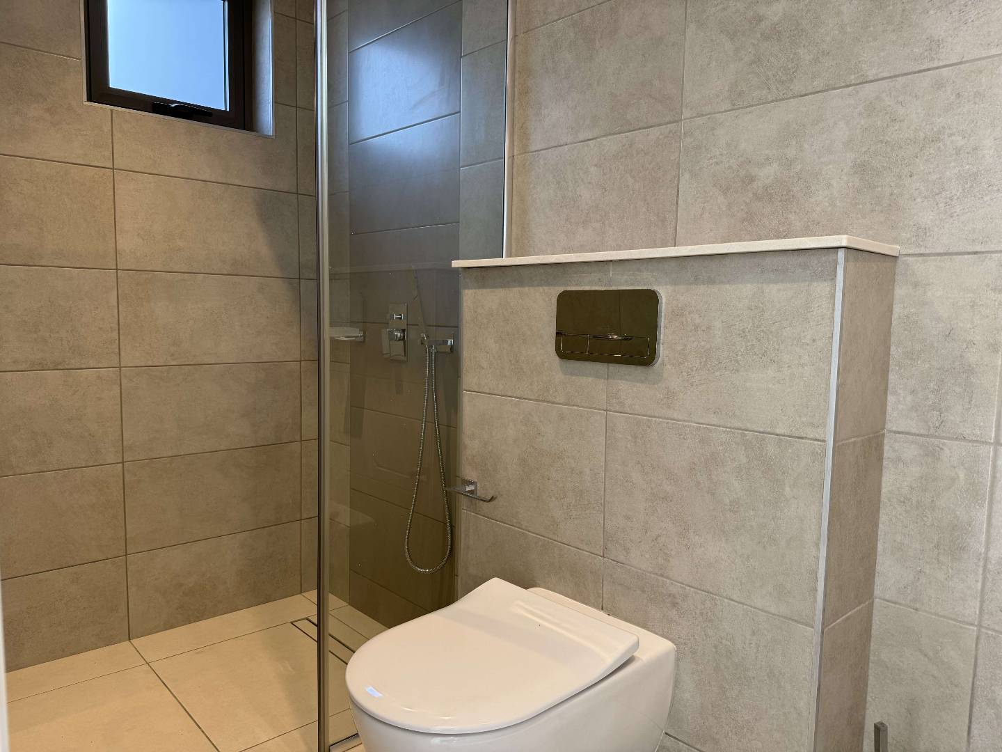 The 130m2 layout includes two well-sized en-suite bedrooms, a guest toilet, and a sleek, fully fitted kitchen complete with Bosch appliances. A separate scullery with washing facilities adds practicality without compromising style. Its north-east facing position enhances light and airflow, creating a bright and welcoming interior.