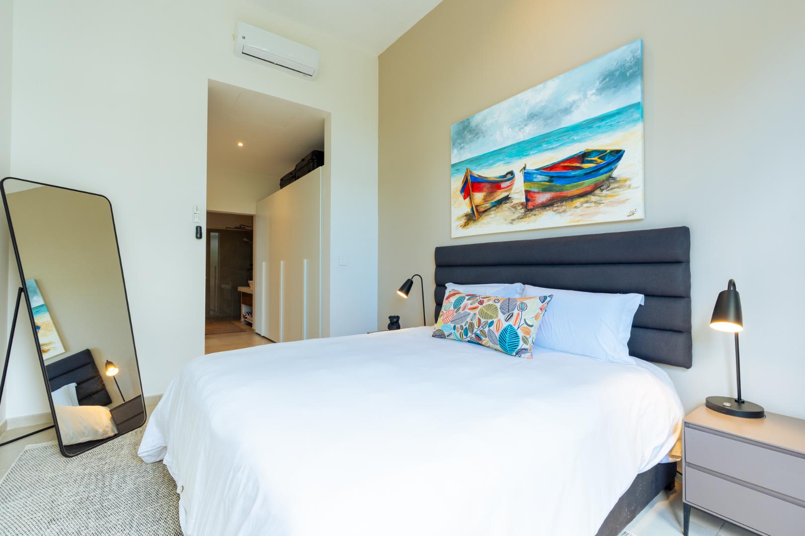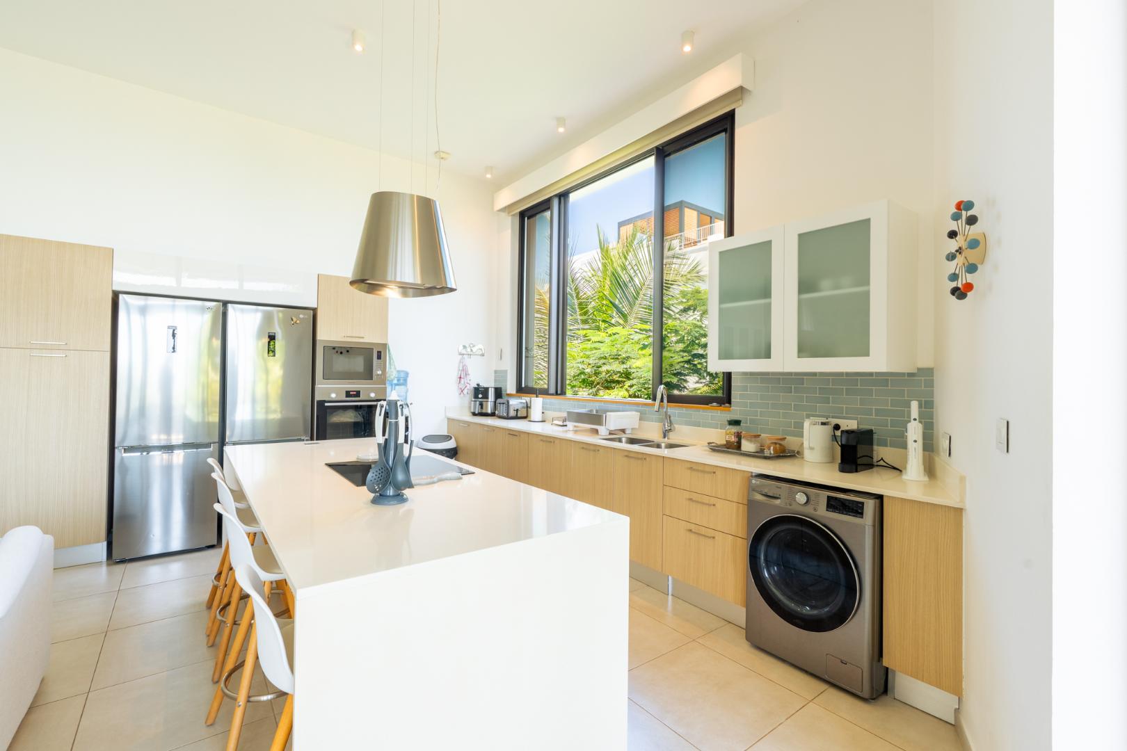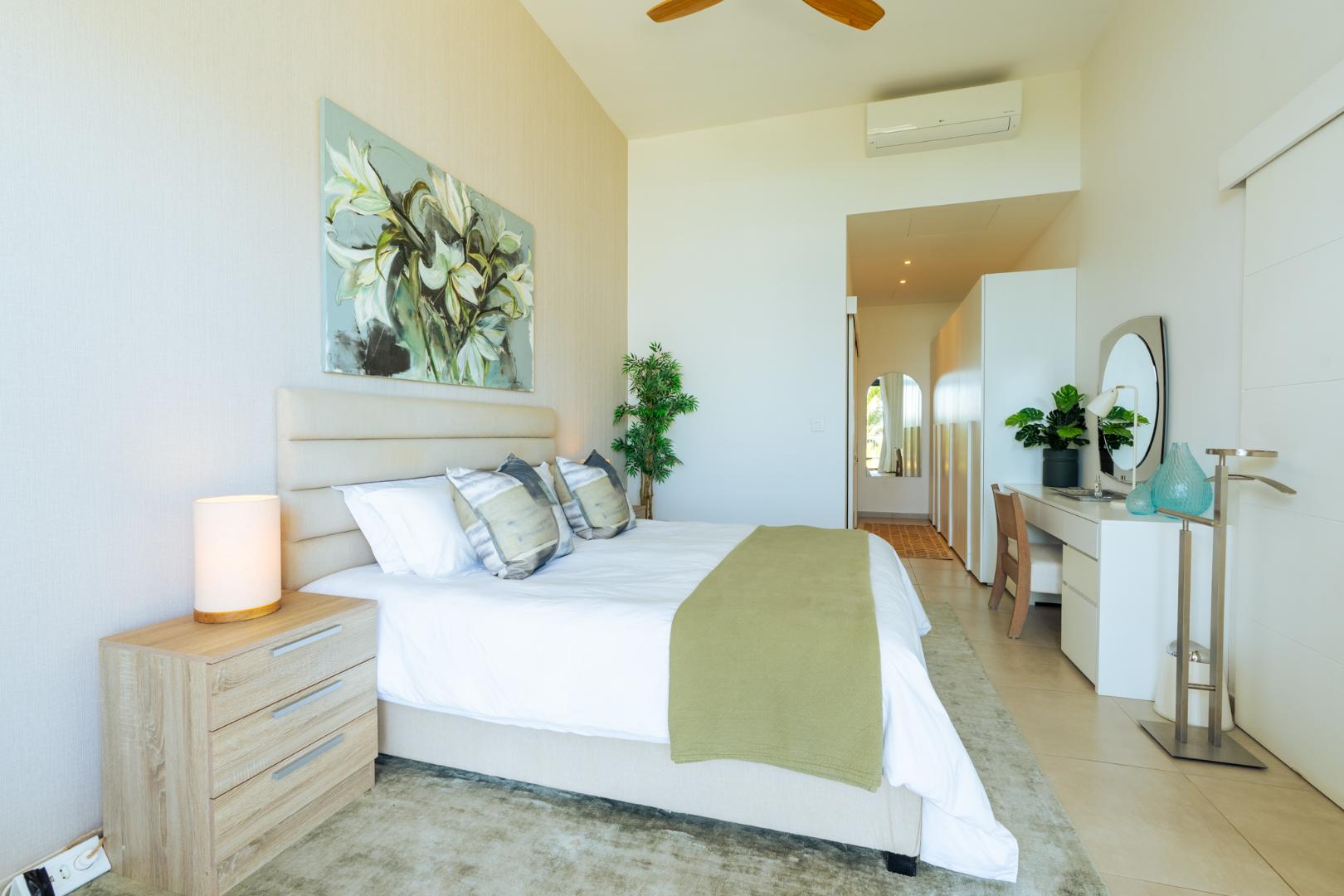 Upstairs, a private 121m2 open air entertainment terrace truly sets this property apart. Designed for effortless entertaining, it includes built in cupboards, a bar counter, a shower and expansive space for dining or relaxing. From here, you enjoy stunning 360 degree views incorporating the ocean, Coin de Mire, Flat Island and the surrounding mountains.