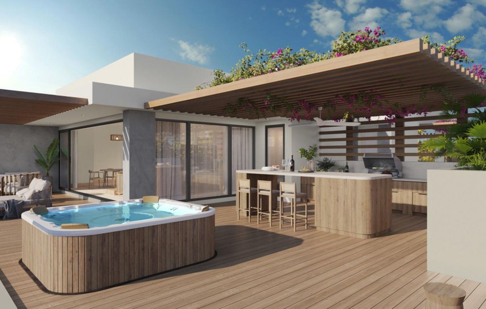 Across the project, unit offerings and penthouses emphasise distinctive architecture, superior materials and refined decoration. Typical sizes include one‐bedroom apartments from 61 m2 to 97 m2, two‐bedroom apartments from 97 m2 to 113 m2, three‐bedroom Deluxe at around 160 m2, three‐bedroom Premium at 200 m2 and three‐bedroom penthouses from 327 m2 to 346 m2. Three‐bedroom units and penthouses typically include a master en‐suite with a large bathtub; optional features for penthouses may include a hammam, Jacuzzi and outdoor kitchen. Selected ground‐floor units include a kitchen yard and private garden. The development offers a clubhouse with gym, kids’ playground, multi‐level swimming pools and event spaces, together with communal leisure areas such as the boma and Sky Bar.