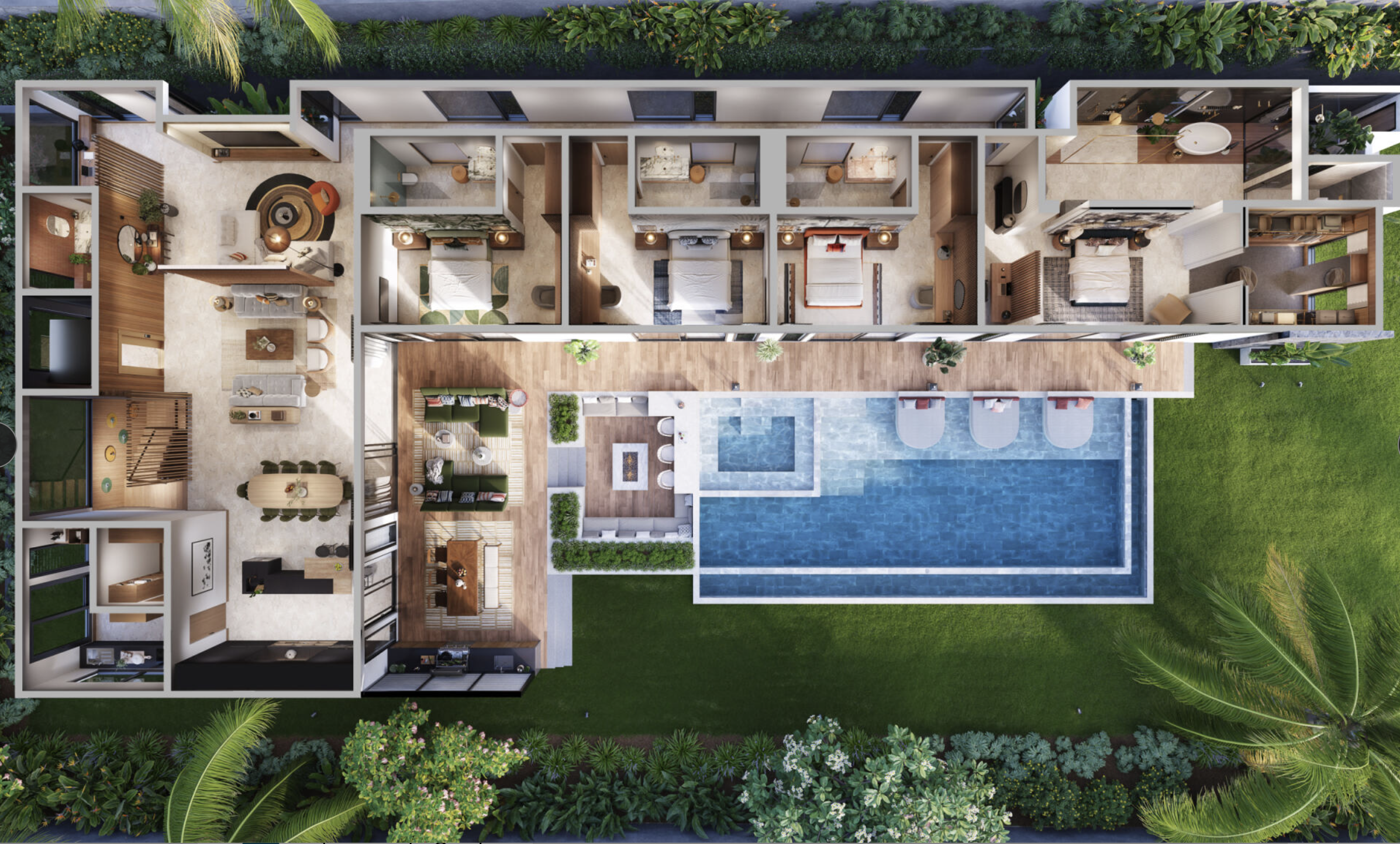 Each magnificent 4-bedroom villa spans approximately 600m2 across meticulously designed spaces, featuring contemporary architecture that harmonizes seamlessly with Mauritius' natural beauty. Floor-to-ceiling windows flood every room with tropical light, while premium materials and bespoke finishes create an atmosphere of refined sophistication throughout.